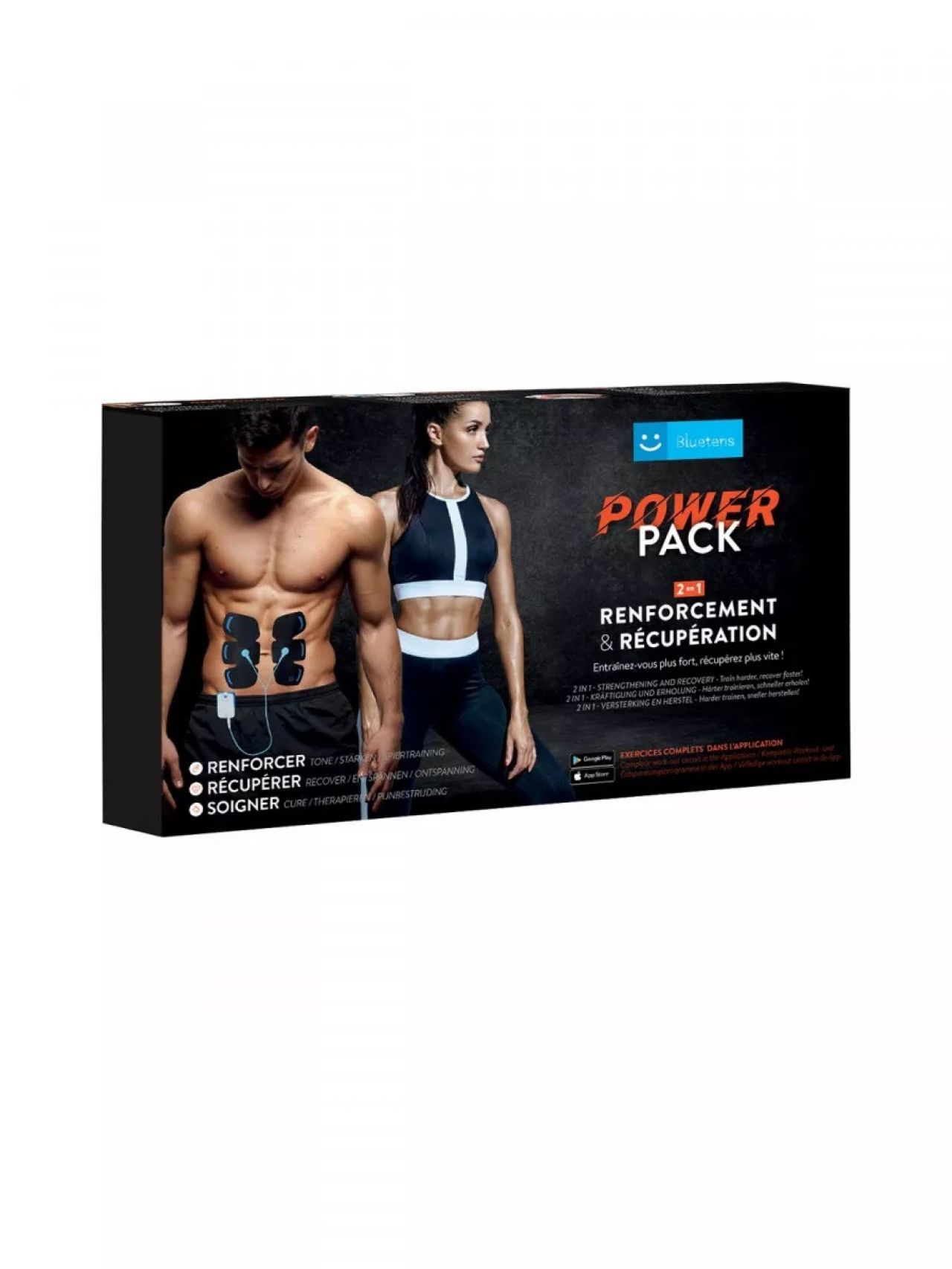 Le Power Pack c'est le coffret spécial abdos : 1 Bluetens Classic et ses accessoires, 1 clip ceinture pour porter votre appareil pendant vos exercices physiques, 1 sachet d'électrodes spéciales qui épousent la forme des abdominaux pour un travail en profondeur.